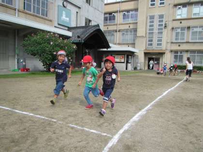 どの子どもたちもかけっこや各学年の遊びを楽しんでいます。3歳児の子どもたちは,初めての運動会の楽しい雰囲気を先生と一緒にすることで安心して遊んでいます。4歳児の子どもたちは,友達と一緒に少し難しいことにもチャレンジしています。5歳児の子どもたちは,自分なりのめあてをもち,チャレンジしたり,ルールを意識し,友達と力を合わせることを楽しんでいます。