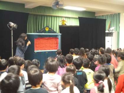初めは、「カエルの王子様」のお話を子ども達が分かりやすいように、おもしろ、おかしく脚色したものを見せて下さいました。子ども達は初めから大笑い。楽しくて思わず、立ち上がってしまう子ども達も多く見られました。また、人形が本当に演じているような、細かい手や足の動きに引き込まれてしまう場面もたくさんありました。