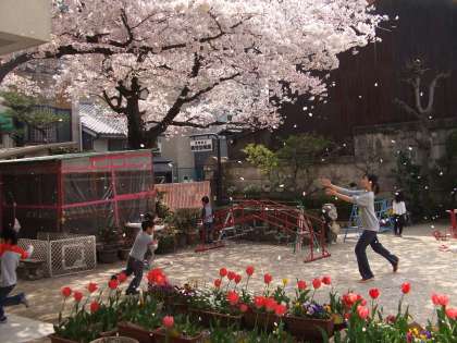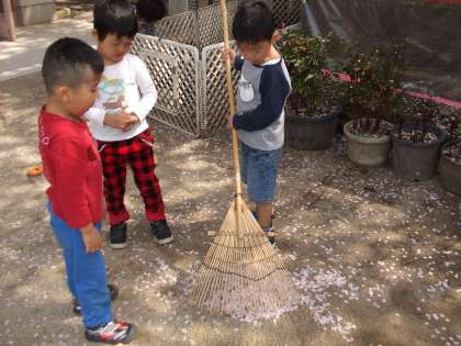 桜の花びらが散る様子をみて,「雪みたい。」「きれい。」と言っていた子どもたち。ほうきで花びらを集めたり,ジュースにしたりして,元気に遊んでいました。