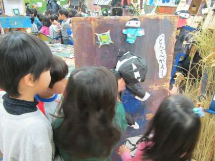 今日は,ばら・ゆり組(4・5歳児)でこども展の見学に行きました。どの作品にも興味をもって,目を輝かせて見ていました。「ぼくらがつくった池だ!」「忍者もいる!どんでん返しもある。」と自分達の作品は特に嬉しそうに見ていました。