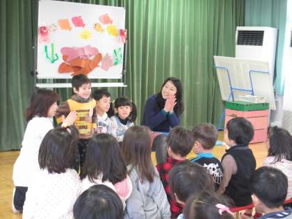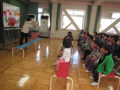 今日は,3月生まれのお誕生会でした。待ちに待ったお誕生会だったので,誕生児の3名は,朝から楽しみいっぱいでした。最初は,先週みんなで遠足に行った水族館のお話を聞きました。たくさんのオウサンショウウオが出てくると,「うわぁ〜!」「きゃ〜」と言いながらも楽しかった水族館を思い出して楽しく聞いていました。