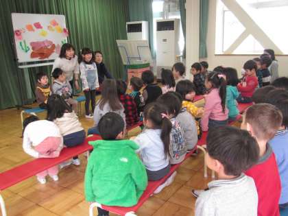お楽しみ遊びでは,ブレーメンの音楽隊のパネルシアターを見ました。色んな動物達が仲良くなって力を合わせ幸せになるお話でした。みんなも,友達と仲良く,時には力を合わせて逞しく大きくなってくださいね。