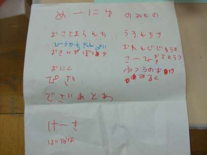年長児たちがおいしそうなケーキをつくってお店屋さんごっこで遊んでいます。ショーケースにならんだケーキを見に年少児や年中児たちがやってくることで,お客さんが喜ぶお店にしようと,テーブルや椅子を積木でつくり,食べてもらえるお店にしました。「ごゆっくりたべてください」とかかれたメニューもできました。