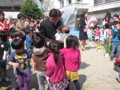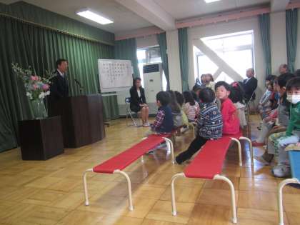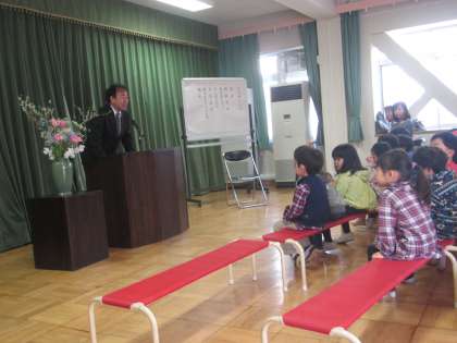 離任される先生方が幼稚園での生活を振り返り,話をしてくださいました。そして,新しい先生のお顔も拝見し,子どもたちは期待を膨らませていました。