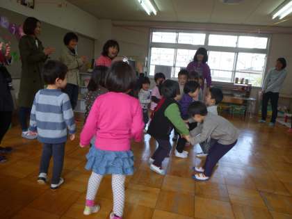 お家の方がいっしょなら,”なべなべそこぬけ”もみんなで大きな輪になってすることができましたよ。成功したときは「やったー!」と歓声があがりました。