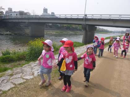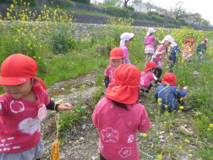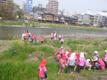 延期になっていた鴨川散歩にばら・ゆり組(4・5歳児)で行ってきました。鴨川河川敷では,西洋からし菜がたくさん咲いていて,とてもきれいでした。「菜の花の島まで探検にいこう!」とみんなでワクワクしながら行きました。子ども達の背の高さくらいある菜の花の間を,ゴツゴツした石の上を歩き探検気分を味わえて楽しそうでした。