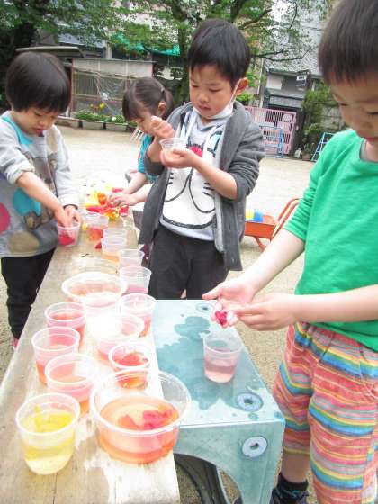 今日は久しぶりの良い天気でした。午前中は少し曇っていましたが,お昼頃より青空が見えはじめ,遊んでいると汗ばむ位でした。砂場では,先週から園長先生とつくっていた大きな山に橋を掛けて,バランスをとりながら渡ったり,キックバイクに乗って渡ろうとしたりして遊んでいました。また,山のふもとにできた川に乗り物を浮かべたり壁を固めたりして遊ぶ子もいました。みんな泥んこになっても気にせずに,気持ちのいい砂や水の感触や冷たさを感じながら楽しんでいました。園庭では,チューリップの花びらが落ち始め,「あぁ〜かれてしもたなぁ・・。」と悲しそうにいう子もいました。けれど,落ちた花びらを使って色水をつくって遊ぶ楽しさを知り,ジュース屋さんをしたり花びらを浮かべて飾ったりして楽しんでいました。好きな色の花びらを見つけに行って,カップにくんだ水の中でグニュグニュ揉むと,だんだんと変わっていく水の変化を楽しんでいました。花びらの色や揉み具合によってみんなそれぞれ違った色で,友達と見せ合って楽しんでいる子もいました。
