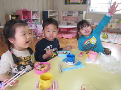 たんぽぽ組(年少児)は,先週からお弁当が始まりました。今日は2回目のお弁当日で,昨日から楽しみいっぱいにしていました。いっぱい遊んだので,お腹もぺこぺこ。みんなもりもりお弁当を食べていました。午後からも元気100%で遊びました。
