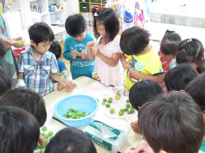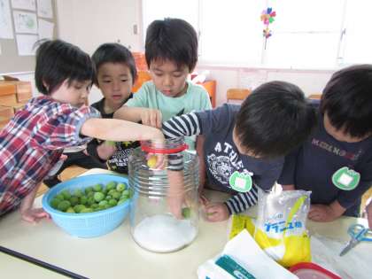 今日は,幼稚園で収穫した梅を使って,梅ジュースをつくりました。子どもたちはきれいに拭いた梅の軸を爪楊枝で取り,一つずつ丁寧にビンに入れ,次にグラニュー糖も入れました。「すぐに飲めるの?」「まだまだ。」「どうやってジュースになるのかな?」と話していました。ジュースになる様子を楽しみ,祗園祭の頃にみんなで乾杯したいと思います。