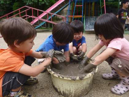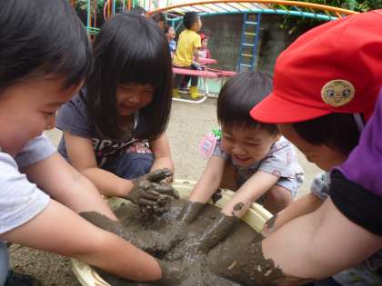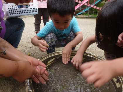 まずは,田んぼの泥んこの感触を十分味わいました。きめの細かい泥んこは砂場の泥んことは違い,気持ちがよくて,「わあ〜」と思わず笑顔になっていました。泥んこの中で手をつないだり,ひじまでつかったりして楽しみました。