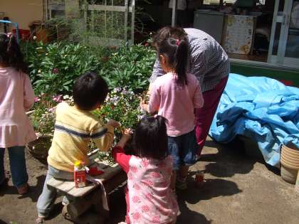 5月10日は母の日ですね。今日は,大好きなお母さんに幼稚園の花壇の花を少しずつ摘んで花束をつくりプレゼントをしました。