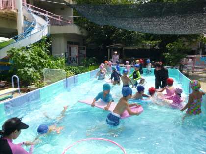 今日から夏季プールが始まり,たんぽぽ組・ばら組・ゆり組が一緒に大プールに入りました。お魚コースで泳いだりビート板の船に乗ってぷかぷか浮かんだりして遊びました。途中でワニやラッコになった先生の上に乗る子や魚の宝探しをする子など,それぞれが思い思いに楽しく遊ぶことができました。