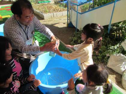次は,「これでは大変だから幼稚園ではこうします。」と,牛乳パックの口に稲をはさみ,口を閉めてひっぱると,ぱらぱらという音がして牛乳パックの中に脱穀したお米がたまっていました。すごい!!「やりたい!やりたい!」と子どもたちの目が輝きます。