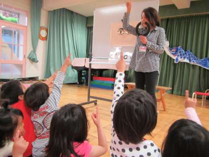 今日は体重測定をしました。測定をする前に,保健職員の先生のお話を聞きました。「美味しそうなドーナツ,ねずみがかじって行ったよ!どっちがかじられたかな?」と聞かれると,「あっち!」と指をさしたり,「みぎ〜!!」と言ったりする子ども達でした。今度,視力・聴力検査があります。ねずみがかじられた方がどっちか,よ〜く見てね。