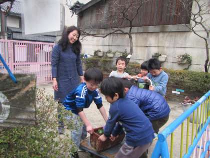 今日は金曜日。毎週金曜日は,大好きな開智幼稚園をピカピカにしよう,綺麗にしよう,と子ども達それぞれが意識をして取り組んでいます。年中・年長組は,パンジー・ビオラなどの花の苗を植えました。幼稚園に鮮やかな花が増えると気持ちも明るく何だか嬉しくなりますね。その後,年長組の男の子達が力を合わせて鉢植えを門の前やスロープに運びました。女の子達から「頑張って〜!!」と声援を受けると,やる気倍増!!友達と「ここに置こう。」「一緒に持とう。」「あそこまで運ぼう。」と協力しながら並べていました。全部運び終えると,自分達で幼稚園を綺麗にした満足感でいっぱいになりました。大好きな幼稚園が綺麗になるとやっぱり嬉しいですね。