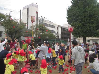 1回戦は在園の子どもたちが紅白に分かれて,2回戦はたくさんのお客様に参加していただいて玉入れをしました。最後は,子どもたちの片付け競争。