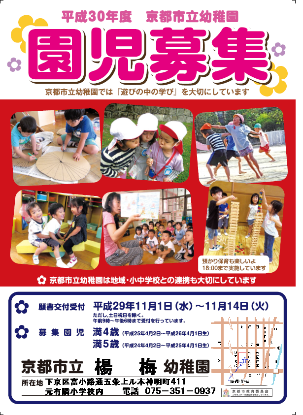 ※楊梅幼稚園は平成29年4月より元有隣小学校跡に移転しています。ご注意ください。住所:京都市下京区富小路通五条上ル本神明町411番地(とみのこうじどおり・ごじょう・あがる・もとしんめいちょう)