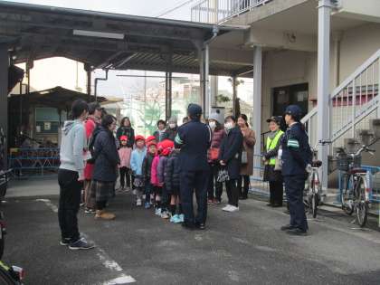 今日は年長児の親子交通教室をしました。下京警察署の警察官にパネルシアターで道路の渡り方を教えていただきました。その後,警察官や地域の方の見守りの中で,実際に道路に出て,お家の人に後ろからついてきてもらって,一人で歩道を歩いたり,信号のある横断歩道を渡ったりしました。