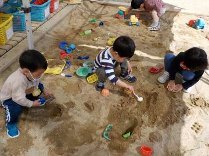 お家の人が家に帰ってしまって,心配になったり,会いたくなったりする様子もありました。でも,先生の近くで,砂場や三輪車,ままごとやすべり台など,遊んでいるとだんだん楽しくなって笑顔が見られたり,黙々と遊んだりと,幼稚園の遊びに興味をもって過ごしました。