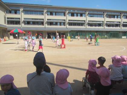 今日は,園庭でミニ運動会ごっこをしました。3学年で,それぞれが楽しんでいることや頑張っていることを見合います。5歳児すみれ組の開会セレモニーをしている様子をじっと見ている3・4歳児の子どもたち。「かっこよかった」と憧れの気持ちをもつ姿もありました。また,かけっこでは,自然と「がんばれー!」の声も生まれ,応援したりされたりする楽しさや嬉しさを味わったように思います。