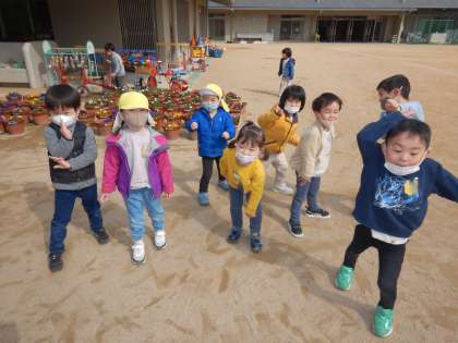 たんぽぽ組は,「だるまさんがころんだ」をしました。動きを止めて待つことはとても難しいことですが,真剣に止まろうと可愛い姿が沢山見られました。初めての取組でしたが,その様子を見ていたすみれ組のお姉さんが,「線を引いて立って待つねん」と言いながら線を引くと,たんぽぽ組の子どもたちは,自然と並んでいました。