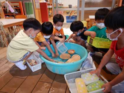 その後は、一学期に遊んだ玩具やロッカー、積み木など、力を合わせて大掃除しました。雑巾で拭き掃除をしたり、水で洗ったり、丁寧に取り組み、自分が終えると、友達を手伝ったり、お休みの友だちのロッカーも掃除したりと、できることを見つけて、最後まで取り組むことができました。