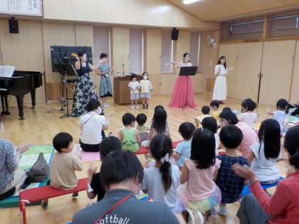 8月30日幼稚園で音楽会が開催されました。音楽家の武市まゆみ先生他、ピアノやフルートの先生方をお招きしての音楽会でした。預かり保育に参加していた子どもたちや未就園児つぼみ組の友達も親子で参加してくださり、楽しいひと時を過ごしました。