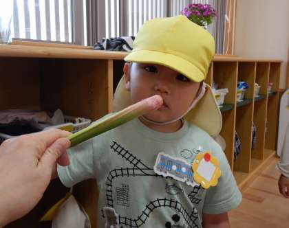 菖蒲を各部屋に飾り、『ハナショウブ』と『ニオイショウブ』の二種類あることを知りました。すみれ組では、ニオイショウブが「みかんのにおいがする!」と発見があったようです。