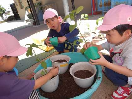 4歳児さくら組は、今日自分の植木鉢に夏野菜を植えました。