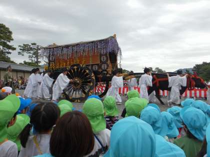 今日は5歳児だけで電車に乗り、葵祭の見学に行ってきました。京都御苑に着くと、会場の雰囲気やたくさんの人達にまだかまだかと思いを膨らませていた子どもたち。路頭の儀が始まると、平安朝貴族の衣装を身に着けた方々や、馬や美しい風流傘などの行列を身を乗り出して見ていました。特に楽しみにしていた牛車や斎王代の登場には、思わず拍手をしたり、「きれい」と見とれたり、手を振ったりする姿も見られ、京都の伝統文化に触れて楽しむ貴重な一日となりました。