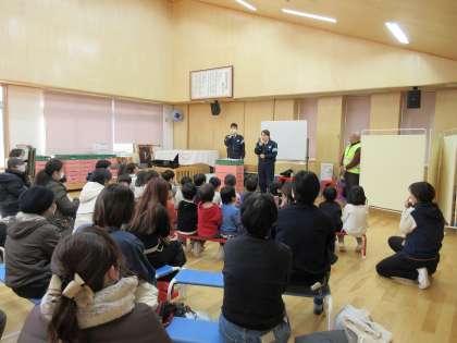 今日は、下京警察署交通課の方や交通ボランティアの方に来ていただき、5歳児の親子で交通教室に参加しました。警察署の方から交通安全についてのお話を聞き、信号の見方・横断歩道の渡り方などを教えていただきました。その後、実際に横断歩道を渡る練習をしました。保護者の方に後ろについていただき、少しドキドキしながらも自分の目で見て確認して交差点を渡った子どもたち。今日教えていただいたこと守りながら、これからも安全に道路を歩いていきましょうね。