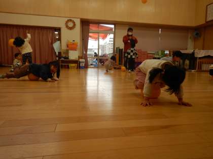 今日は、お遊戯室でボール遊びをしました。
