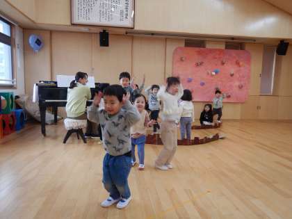 子どもたちはいつもの遊びや生活の中で、色んなものになりきって遊ぶことを楽しんできました。今日もクラスのお友達と先生と、元気いっぱい表現して遊ぶことを楽しんでいました。