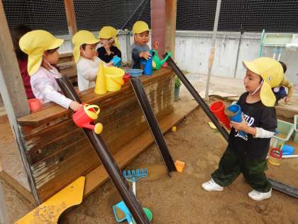 今日は砂場で“ウォータースライダー”をつくって遊ぶ姿が見られました。4歳児が樋をつなげて水を流して遊んでいると、同じようにやってみたいと思ったA児。樋を見つけると「ウォータースライダー」と言って、教師と一緒にログハウスに立てかけました。A児がジョウロで水を流し始めると、側にいた子どもたちも同じように遊び出し、いつの間にかたくさんの“ウォータースライダー”ができていました。何度何度も水を流すことを楽しんでいた子どもたち、楽しかったね!また一緒に遊ぼうね。