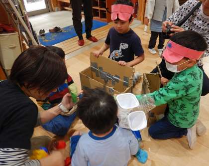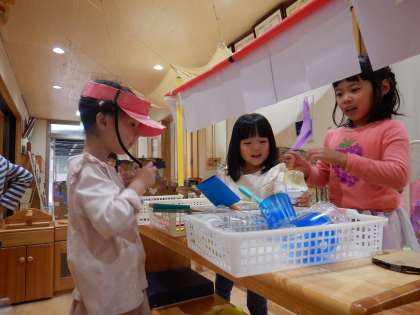 「店員さんの帽子もいる!」など、イメージを膨らませながら、遊びを楽しんでいます。
