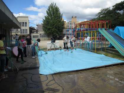 認定式の後は、いよいよプール片付けです。お母さん・お父さん、たくさんおうちの方に参加してもらいみんなでプールを解体したり、洗ったりしていただきました。