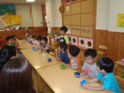 今日は1年生お招き会。久しぶりの幼稚園!懐かしい仲間や先生と一緒に過ごしました。短い時間でしたが,一人ずつ学校の話もきかせてもらい,元気な姿がみられてとてもうれしかったです。みんなでおやつも食べて楽しい時間を過ごしました。もも組・あお組の預かりの子どもたちも一緒に園庭で遊べ,喜んでいました☆