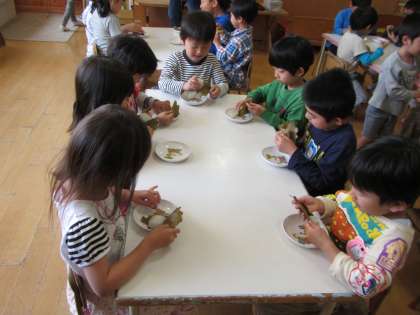 今日は,子どもの日の集いをしました。みんなで五月人形を見たり,こいのぼりのお話を聞いたりしました。菖蒲の香りもどんな香りがするのかみんなで楽しみました。そして,鼓月様からいただいた柏餅をみんなで食べました。子どもたちは「おいしい!」とニコニコ顔。鼓月さんありがとうございました。これからも子どもたちが元気にすくすくと育ってほしいと願います。