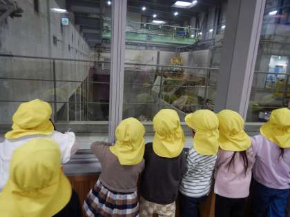今日は、全園児で「さすてな京都」に園外保育に行きました。身近な生活からごみに関するお話を聞いたり、絵本を見たりして、工場の見学に出かけました。大きなごみクレーンがたくさんのゴミを掴んで動く様子に驚いたり、ごみのゆくえを教えてもらったりしました。ごみを出さないように日々の生活の中で私たちができることは何か考えることもできました。また、道路を走るごみ収集車をたくさん見つけて喜んだり、煙突の展望台からの景色を眺めて楽しんだりしました。