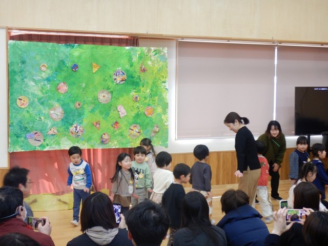 お家の人に見てもらうことを楽しみにしていた子どもたち。嬉しい気持ちや少しドキドキした気持ち、いろいろな気持ちを感じながら、自分なりに表現することを楽しんでいました。劇遊びでいろいろな表現をしたり、歌ったり、楽器遊びをしたり、それぞれのクラスが今まで楽しんできた遊びを見ていただきました。