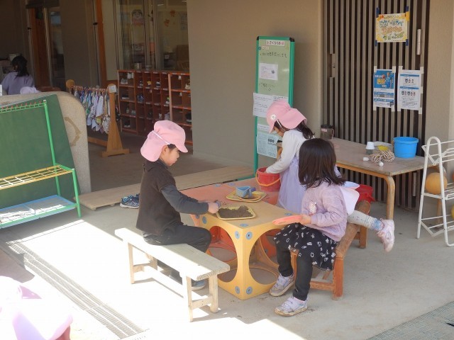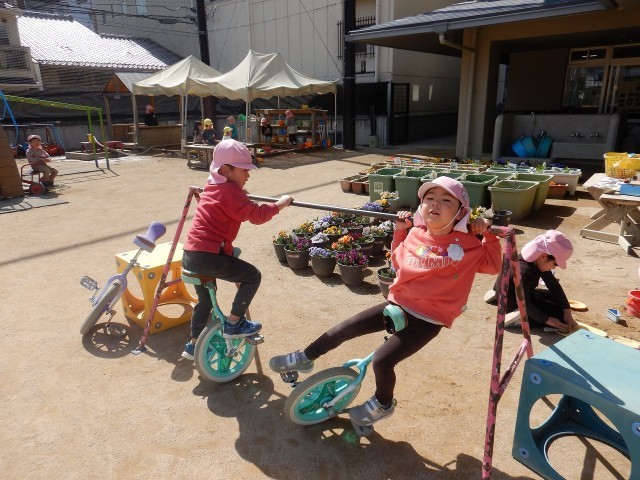 風が少し冷たい日でしたが、春の陽ざしを感じながら、子どもたちは園庭で元気いっぱい遊んでいます。