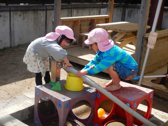 砂場では、裸足になり、水を使った遊びを楽しむ姿が見られました。友達と一緒に、「どうしたら水がうまく流れるかな」と考えながら、ホースの位置を調整したり、自分たちで素敵な場所をつくってごちそうづくりを楽しんだりしています。