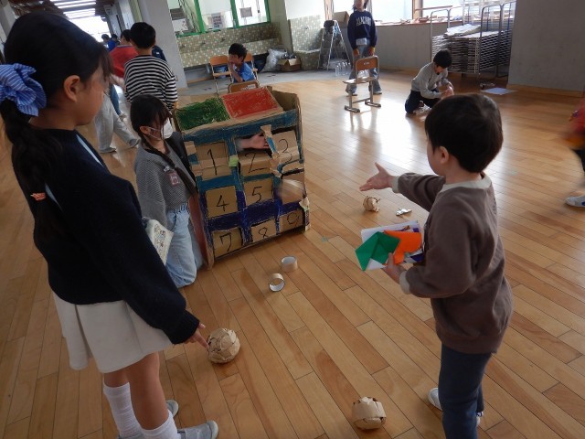 ボーリングや、砂鉄スライム、ぬりえ、クイズ、ビンゴなどなど・・・授業で学んだことを取り入れながら、たくさんの楽しいゲームや遊びを3年生が考えてくれました。