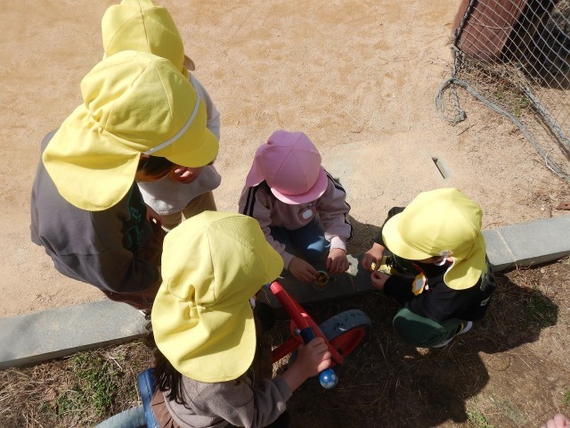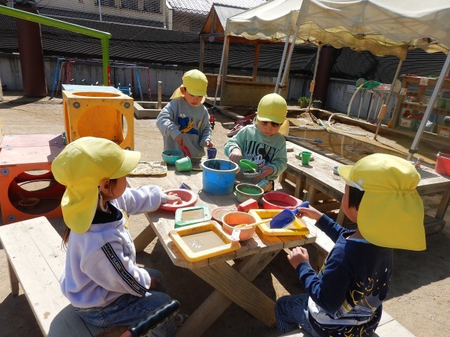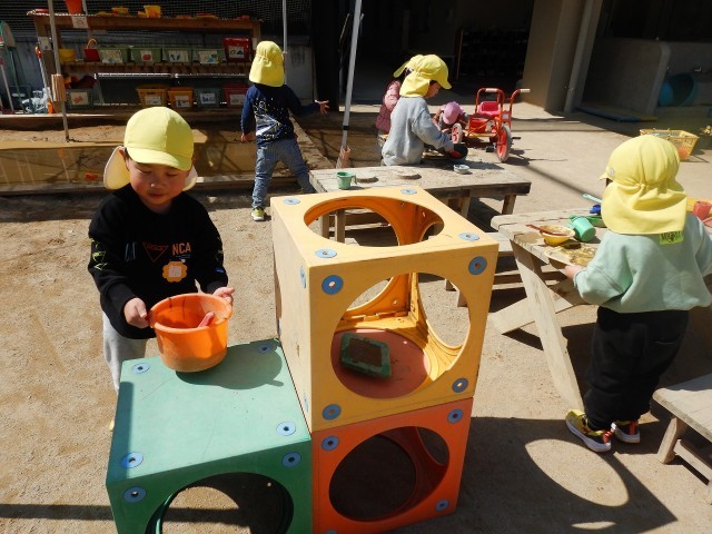 ぽかぽか暖かい陽気の中、園庭で遊ぶことを楽しんでいた3歳児たんぽぽ組の子どもたち。今日は、砂場で友達と集ってごちそうをつくることを楽しむ様子がありました。たんぽぽスープ、パンピザ、オムライス・・・などそれぞれがイメージを膨らませてつくることを楽しんでいました。「お塩を入れて」と白い砂を入れてお料理をしていた子どもから、周りの友達に広がってまたそれを同じように楽しむ様子がありました。「オーブンで焼くよ」「レンジで3分温めよう」「かためるよ」などとゲームボックスでつくった電子レンジやオーブンで焼いたり、温めたりして出来立てのごちそうが出来上がりました。最後はごちそうを囲って、みんなで「いただきます」と大満足の子どもたちでした。他にも、乗り物に乗って友達と並走したり、押し合ったり、たんぽぽ探検と出かけたり、警察ごっこをしたりなどいろいろな友達と関わって遊ぶことが楽しくなってきています。