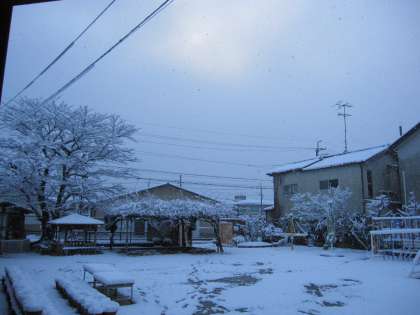 その願いが通じたのか、始業式の日も雪がつもり、雪景色。