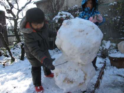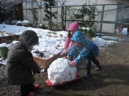 大きな雪玉を作ってそりで運び、雪だるまもできました。