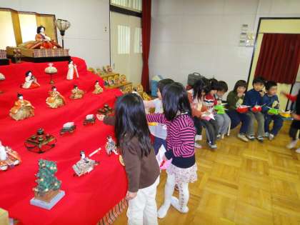 子どもたちが元気に大きく育つようにとひな人形が飾られたという由来を聞き、みんなでひな人形を見ていると、いろんなことに気付いた子どもかいました。