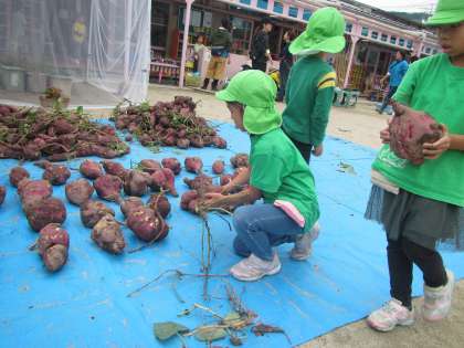 子どもたちからもお家の皆さんからも歓声が上がっていました。頑張って園に持ち帰り,「大きいのはいくつとれたかな?」「重たいな!」と並べたり,つるを食べられるように摘んだり,引っ張ったり,リースをつくったりして遊びました。