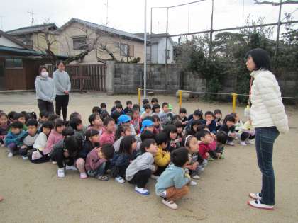 昨日の避難訓練は,年長児はそれぞれがいろいろな場所で遊んでいる場面で,年少児はクラスで活動している場面で,地震が起きたことを想定して行いました。