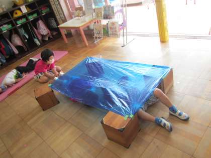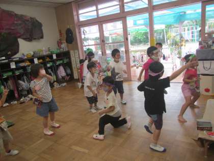 自分の好きな色でつくった額当てをつけると,忍者に変身する,はな組の子どもたち。